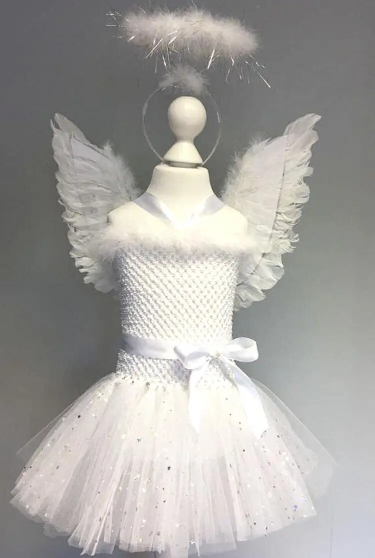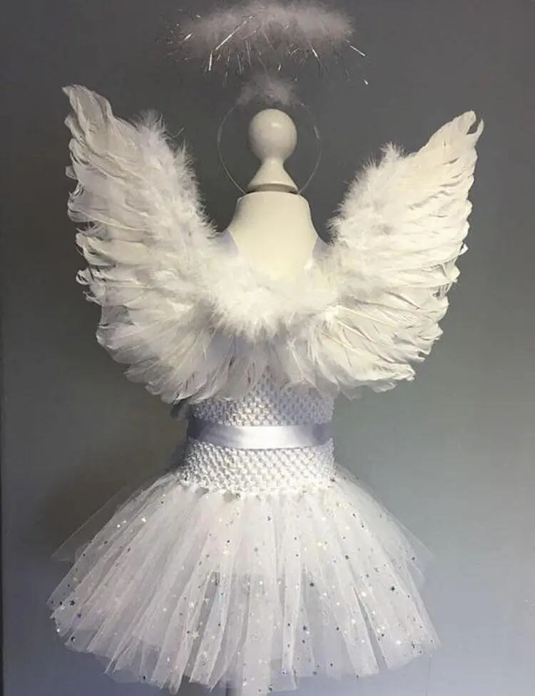 BEST QUALITY White Sparkle Girl Feather Angel Birthday Party Tutu Dress Kids Costume Christmas Clothes Party Cos