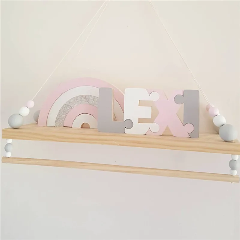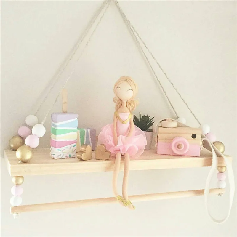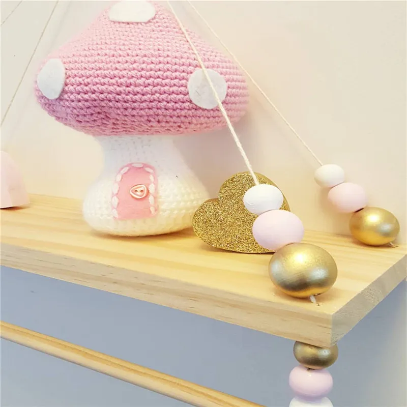 Ins Nordic Style Nursery Decor Wooden Wall Shelf with Pearl and Tassel Kids Room Clothes Decoration